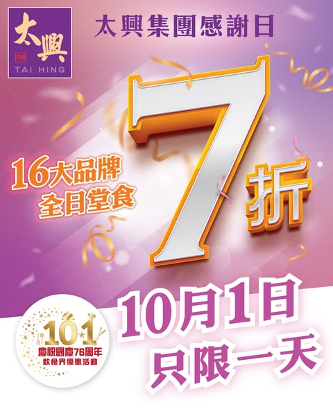因為10月1日是 #太興集團感謝日,全日堂食7折*,只限一日