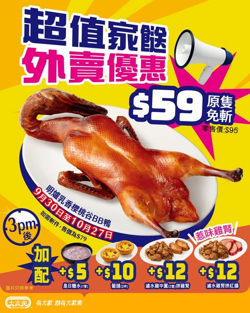 超值滋味 | 大家樂明爐乳香掛爐BB鴨火熱登場香噴噴嘅明爐乳香掛爐BB鴨,啖啖香脆肉嫩又多汁,真係唔可以錯過呀!即日起至10月27日,就可以超抵價$59帶佢返屋企慢慢嘆喇!另外,仲有熱賣小食「滷水雞腎拼雞翼(2隻)」同「$12 滷水雞腎拼紅腸」,每款只係加$12咋,咁豐富抵食,一定要嚟斬料加餸喇!明爐乳香掛爐BB鴨 (原隻免斬) 推廣期:即日起至10月27日 供應時段:下午3點後 只限外賣 數量有限,售完即止!加餸專區+$5加配是日糖水+$10加配葡撻(2件)+$12加配滷水雞腎拼雞翼(2隻)+$12加配滷水雞腎拼紅腸*數量有限,售完即止下載大家樂Club 100 APP,一齊Joy,不停賞 https://bit.ly/club100cdcfb