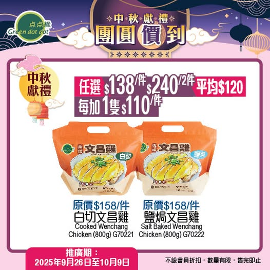 【中秋推介!海南名菜 #文昌雞 陪你過節】中秋就快到,「無雞不成宴」!不如試下海南四大名菜之一的文昌雞,肉質嫩滑又多汁,雞味濃郁,宴客夠大方!原價$158 → 中秋特價$138/隻,$240/2隻,即慳$76!白切/鹽焗兩款口味任選~解凍翻熱10分鐘即上碟,方便到極!海南四大名菜之一|廣東八大優良雞種 飼養足150天|原隻鎖住肉汁嫩滑多汁|雞味濃郁加熱即食|兩款口味團圓飯加餸零難度,親戚朋友食過都讚!優惠期至2025年10月9日網店訂購:https://bit.ly/3JZEknt
