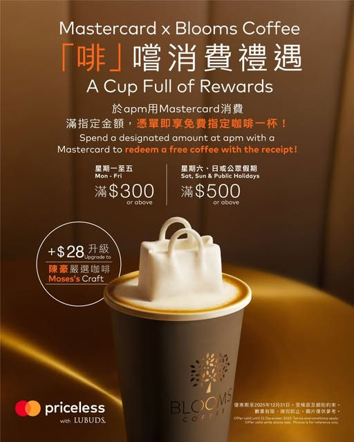 【 Mastercard x @bloomscoffee|「啡」嚐消費禮遇 】喺apm享受購物無盡驚喜,再點一杯 Blooms Coffee 嘅香醇咖啡,即可完美點綴你嘅購物之旅!由即日起,用 Mastercard 喺apm任何商戶簽賬,滿足以下消費要求,憑即日單據直接去Blooms Coffee,即可免費換領指定咖啡一杯!星期一至五 消費滿 HK$300 或星期六、日及公眾假期 消費滿 HK$500即賞12oz牛奶咖啡、摩卡咖啡或泡沫咖啡(熱/凍)想將咖啡時刻再升級?只需加 $28就可以享用「陳豪嚴選咖啡」,昇華你嘅「啡」嚐體驗,帶來更精緻嘅味蕾享受。即刻就嚟apm盡情購物兼品味咖啡,嘆額外獎賞!Blooms Coffee | Shop UC - OS1*受條款及細則約束,詳情請向Blooms Coffee店員查詢。數量有限,換完即止。圖片僅供參考。