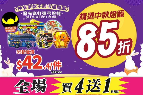 精選中秋燈籠85折仲有幾日就係中秋節啦快啲嚟日本城揀靚靚燈籠賞月啦多款可愛款式仲有投射功能大人同小朋友都實鍾意仲有多款發光精品等你發掘即刻嚟門市睇款式開心過中秋全場商品買4送1全線日本城門市、易購點及「一CLICK即日拎」同步優惠即刻嚟掃貨啦網店「自取或送貨 - 倉庫/ 供應商派貨」獨家優惠購買5件商品滿$120即享85折*優惠受條款及細則約束*款式視乎店舖供應*數量有限,售完即止*圖片只供參考