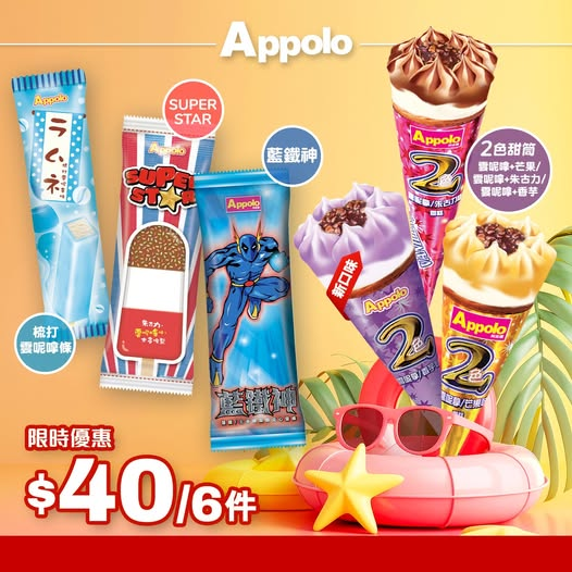 【天狂減大驚喜】阿波羅最近推出左咁多款新口味嘅雪糕/雪條,有無邊款想試吓?唔好諗咁多,嚟緊呢個星期嘅推廣優惠多籮籮,等你唔使心思思,可以一次過輕鬆試勻晒!本星期優惠有:甜筒區:多款口味嘅【2色甜筒】,包括有:雲呢拿芒果味、雲呢拿朱古力味同埋雲呢拿香芋味;清新又香滑,滿足你雙重味蕾!雪條區:懷舊口味代表有【Super Star】、【藍鐵神】,仲有和風口味【梳打雲呢嗱條】,每一款都夠晒特色,帶你穿梭童年回憶!咁多款冰凍甜點點揀好?唔使揀啦,一次過買齊六款都只係$40,限時日優惠至10月12日,數量有限,售完即止!* 優惠不適用於尖沙咀、旺角、將軍澳連理街、紅磡及部份分店。詳情需以店內宣傳品所示之資料為準。