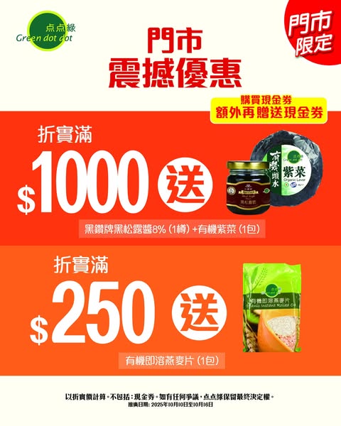 【Mega Sales快閃|購物滿$150即享8折*】#門市限定Mega Sales又到啦全場多款有機天然產品俾你選擇依家只要購買正價產品折實滿$150,就可以享8折優惠*折實滿$250送点点綠 有機即溶燕麥片(大片) 一包折實滿$1000送点点綠 有機頭水紫菜 + 黑鑽牌 黑松露醬8% 一套 ; 購買現金券額外再贈現金券優惠期:2025年10月10至16日 (7天)歡迎蒞臨門市查詢及購買*優惠以正價計算。不包括:巡迴試食、寄銷產品、購買米券、現金券。如有任何爭議,点点綠保留最終決定權