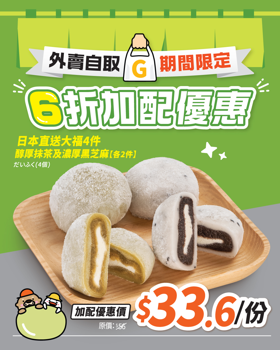 即可以6折優惠價$33.6 (原價 $56) 加配日本直送大福4件 - 醇厚抹茶/濃厚黑芝麻(各2件)!