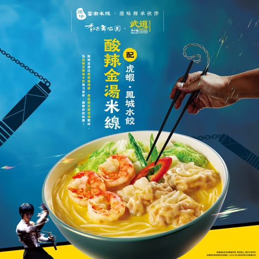 ,仲帶咗全新「酸辣金湯米線配虎蝦•鳳城水餃」返嚟,金黃色嘅酸辣金湯同李小龍經典黃金戰衣look互相呼應