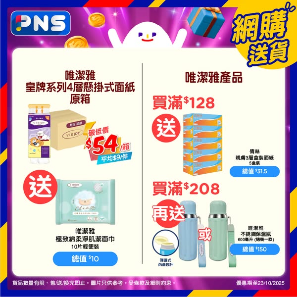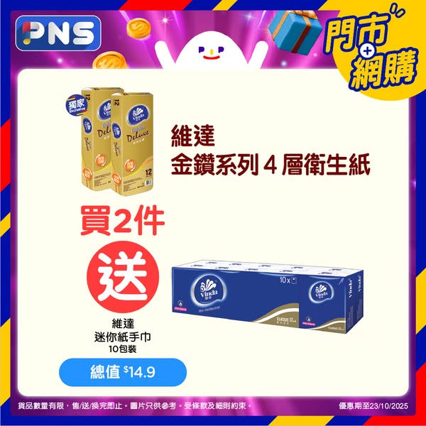 Tempo旗艦店產品優惠期至2025年11月20日。其他產品優惠期至2025年10月23日。C&S及維達優惠適用於有售賣此貨品之香港百佳店舖及PNS網購。其他產品優惠只適用於PNS網購。需登入PNS網購以查看贈品優惠。贈品數量有限,送完即止。優惠以每張訂單計算。圖片只供參考。受條款及細則約束。