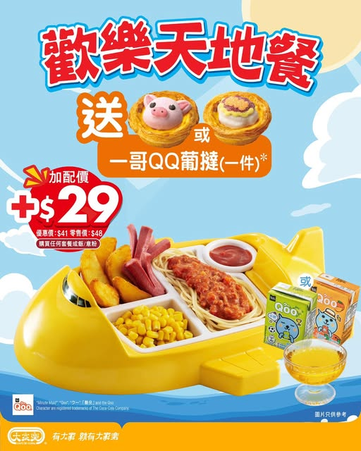 【帶小朋友歎大家樂「歡樂天地餐」送葡撻! 歡樂再加倍!】同小朋友出街食飯想好玩好味又抵食?一於帶佢哋嚟大家樂試下「歡樂天地餐」喇~只要購買任何套餐或飯/意粉,就可以用$超抵價加配!!宜家仲做緊限時優惠送「一哥QQ葡撻」一件!小朋友見到實好開心快啲帶埋小朋友嚟大家樂歎下喇!歡樂天地餐歡樂A餐- 番茄肉醬意粉歡樂B餐- 粟米雞肉漢堡飯歡樂C餐-炸雞中翼芝士汁扭紋粉歡樂D餐-蜜糖雞扒番茄汁意粉以上套餐均配:牛油粟米、香辣薯角、香腸同啫喱!Qoo白提子汁/橙汁飲品任你揀! 優惠期:即日起至10月27日下載大家樂APP,一齊Joy,不停賞 https://bit.ly/club100cdcfb