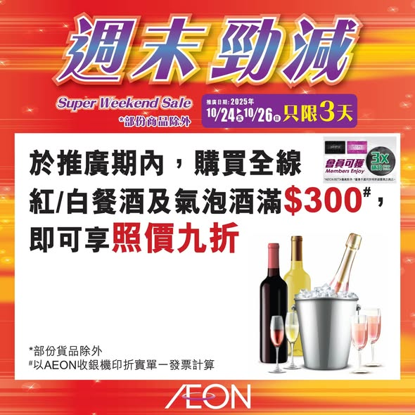 】聽日至10月26日舉行嘅週末勁減,AEON精選多款熱賣商品特價發售!即刻望望有咩筍貨啦! 順帶一提,唔知大家做咗AEON會員未呢?而家新登記成為AEON會員,仲可獲得迎新優惠券,立即登記啦!