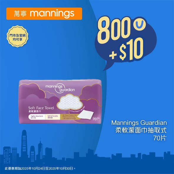 積分兌換獎賞800積分 + $10換購一件Mannings Guardian柔軟潔面巾抽取式 70片▲