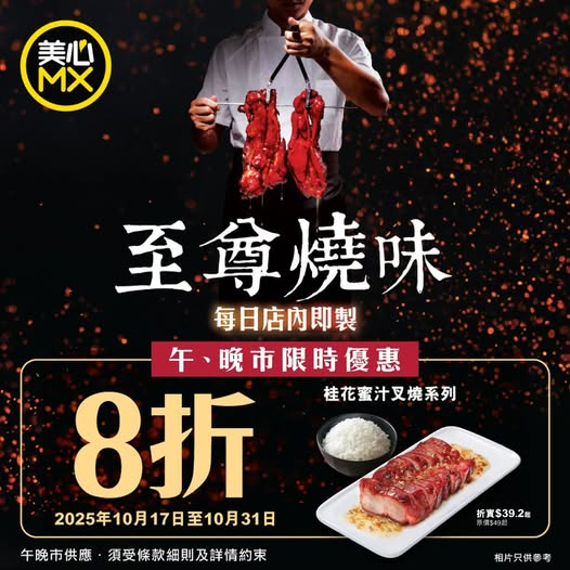 【美心MX限時折優惠】桂花蜜汁叉燒系列午、晚市嚟美心MX嘆「桂花蜜汁叉燒系列」,即享超抵限時折優惠!桂花蜜汁叉燒.白飯桂花蜜汁叉燒雙拼.白飯午市配茶/啡 或 單點 (折實$39.2起,原價$49起)晚市 配燉湯 或 老火湯 (折實$47.2起,原價$59起)每日店內即製熱辣辣「桂花蜜汁叉燒」即刻約埋親朋好友一齊嚟嘆啦!優惠期:2025年10月17日至10月31日適用分店:全線美心MX分店供應 (大會堂、西九龍站及大學站分店除外) 溫馨提示:優惠詳情請參閱店內宣傳品,不適用於自助點餐機及手機點餐及不可與其他優惠同時使用!