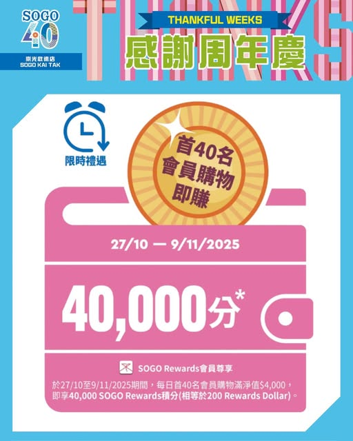 27/10 - 9/11/2025 期間,SOGO Rewards 會員仲有尊享禮遇,每日頭 40 位買滿 $4,000 即賺 40,000 積分