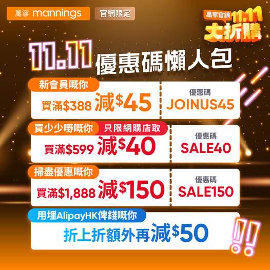 # 優惠碼優惠期由即日起至2025年11月13日。須於結帳前輸入優惠碼方可享優惠。每個訂單只能使用一個優惠碼。此優惠碼只適萬寧官方網店之會員使用(不適用於以訪客身份結帳),每位會員最多可使用該優惠碼三次。以單一發票及折實價計算。此優惠碼不適用於購買初生配方嬰兒奶粉、處方藥物、出位價產品及換購價產品及無折扣貨品。詳情請參閱條款及細則。