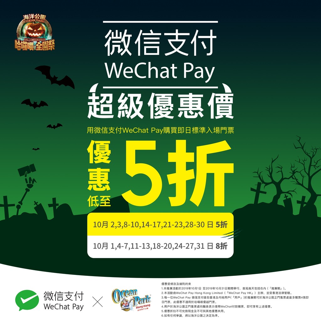 由10月1日起至31日,WeChat Pay HK用戶使用電子錢包於海洋公園正門購買即日標準入場門票,即可獲高達半價折扣優惠。優惠包括於星期一至星期四平日購買海洋公園即日標準入場門票,可享五折優惠(10月24日及31日除外);而星期五至星期日、公眾假期以及10月24日及31日購買,則可獲八折優惠。
