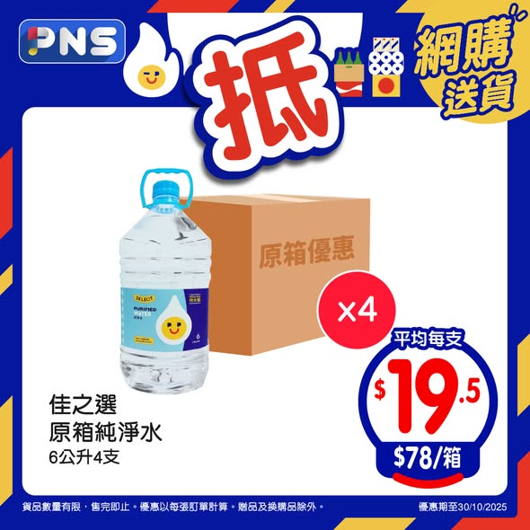 佳之選 原箱純淨水 6公升4支,優惠價$78/箱,平均$19.5/支