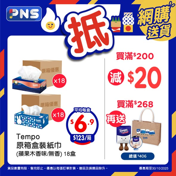 買滿$268,再送Tempo限量版購物袋 + 手抱紙巾仔優惠期至2025年10月30日。優惠只適用於PNS網購之送貨訂單。需登入PNS網購以查看贈品優惠,贈品包裝/款式/口味由系統選擇。贈品數量有限,送完即止。優惠以每張訂單計算。圖片只供參考。受條款及細則約束。