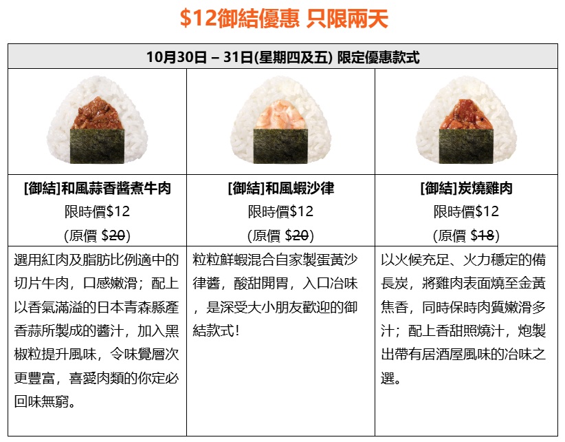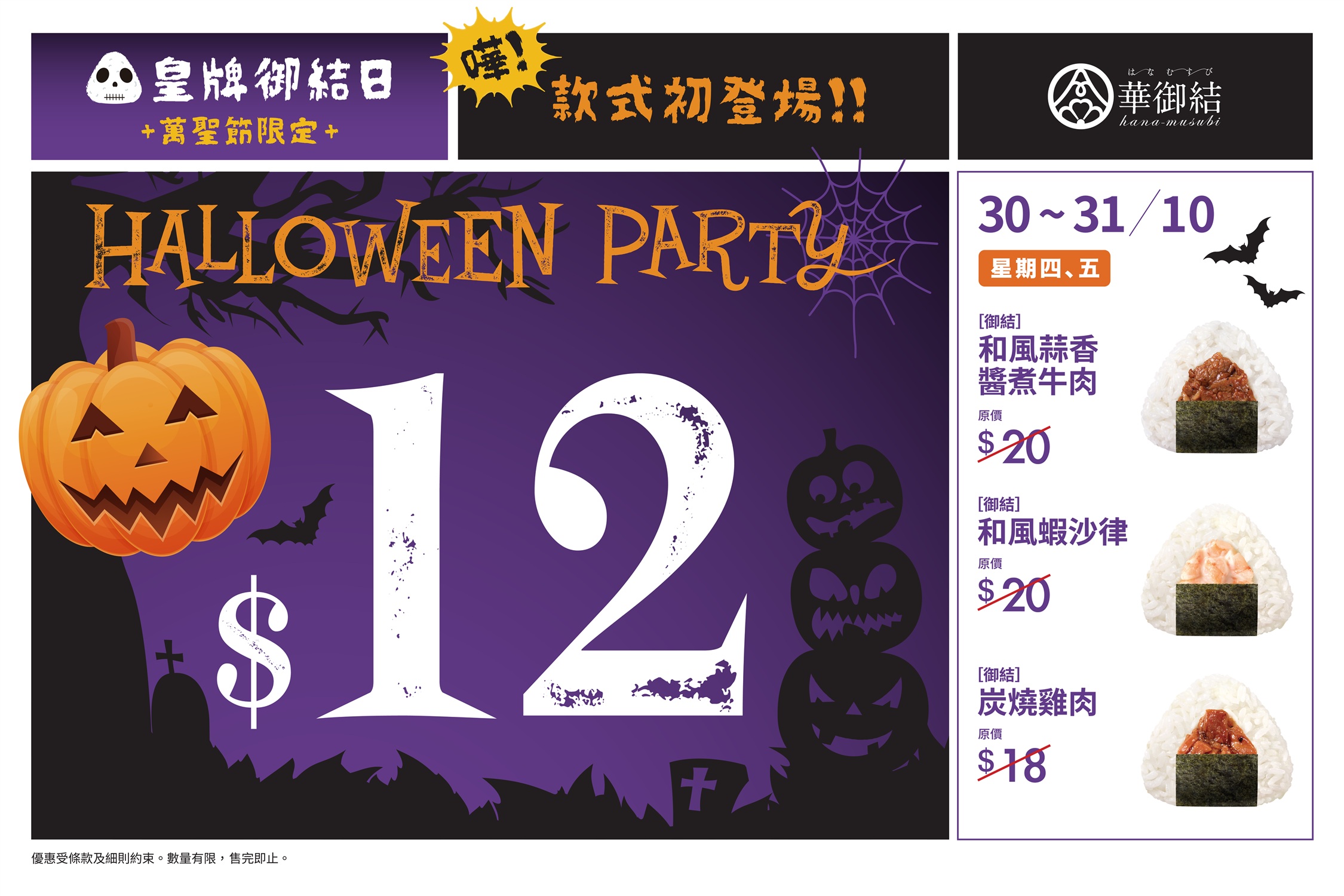 萬聖節限定! 華御結$12御結優惠將於10月30日及31日兩天限時登場! 今回推出的款式更是首次以$12優惠價登場,最啱各位御結迷去各大Halloween Party前醫肚打定底! 三款優惠御結款式包括和風蒜香醬煮牛肉(原價$20)、和風蝦沙律(原價$20)、炭燒雞肉(原價$18);數量有限,售完即止。即刻記低日期,準時搶購!
