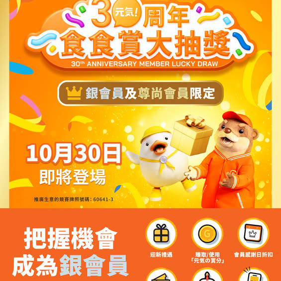 【萬眾期待!30周年重量級會員驚喜即將登場】元気由日本登陸香港30周年咁大件事,就梗係全年都Keep住派勁震撼嘅驚喜!!咁開心嘅事就當然唔好畀佢停,所有 #銀會員 同 #尊尚會員 ,準備接極重量級嘅surprise啦!!過幾日,我哋將會為所有銀會員同尊尚會員帶嚟重磅驚喜活動,送出總值超過五百萬港幣嘅獎品,答謝大家一直以嚟嘅支持!!!未係會員心郁郁想參加?只要你係基本會員,喺會籍期內連續62日累積消費滿HK$950就可以升級做銀會員,迎接一連串咁有heart嘅精彩活動!推廣生意的競賽牌照號碼:60641-3