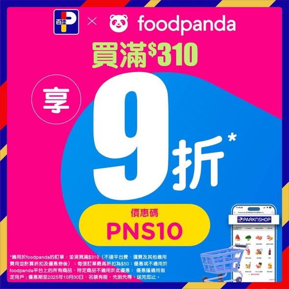 #適用於foodpanda的訂單,並須買滿$310(不連平台費、運費及其他適用費用並計算折扣及優惠券後);每張訂單最高折扣為$50;優惠或不適用於foodpanda平台上的所有商品,特定商品不適用於此優惠; 優惠僅適用指定用戶 ; 優惠期至2025年11月30日,名額有限,先到先得,送完即止。