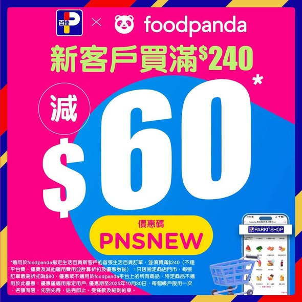 *適用於foodpanda指定生活百貨新客戶的首張生活百貨訂單,並須買滿$240(不連平台費、運費及其他適用費用並計算折扣及優惠券後);只限指定商店門市,每張訂單最高折扣為$60,優惠或不適用於foodpanda平台上的所有商品,特定商品不適用於此優惠;優惠僅適用指定用戶; 優惠期至2025年11月30日,每個帳戶限用一次,名額有限,先到先得,送完即止。受條款及細則約束。
