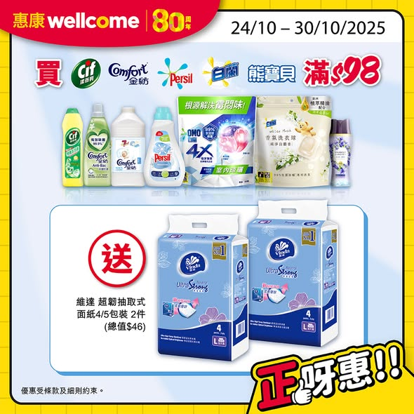 買任何 潔而亮/金紡/寶絲/白蘭/熊寶貝 產品滿$98,送維達超韌抽取式面紙4/5包裝 2件 (總值$46) 幫你屋企保持乾乾淨淨、舒舒服服,散發淡淡清香