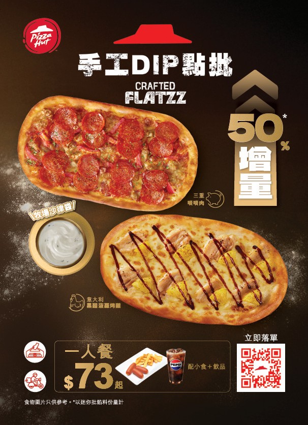 Pizza Hut 全新手工 DIP 點批正式登場,融合經典必勝批與人氣 DIP 脆批概念,打造全新「獨」食法。兩款口味「三重啖啖肉」及「意大利黑醋菠蘿烤雞」均採用人手搓製批底,長約 27cm^,餡料增量達 50%*,獨食也能滿足感爆棚!配上秘製牧場沙律醬,既可品嚐 Pizza 原味,又可盡情 DIP 醬,享受雙重滋味。
