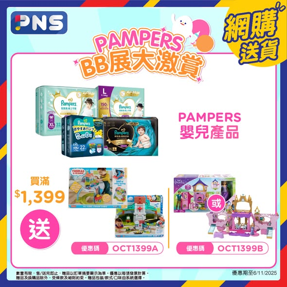 輸入優惠碼「OCT1399B」,送樂佩公主高塔場景組合或馬車城堡玩具組合(款式由系統選擇) 買PAMPERS嬰兒產品滿$1,899: