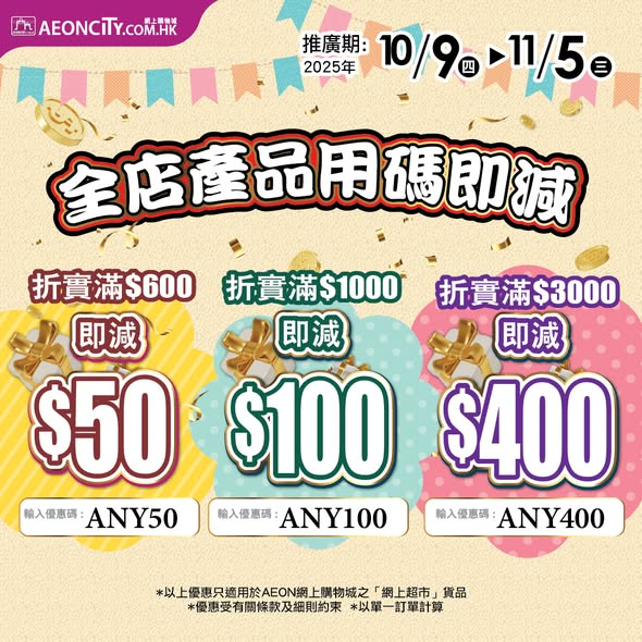 https://bit.ly/4ogdRRU「AEON 38周年呈獻:網上限定優惠碼」推廣期: 即日至2025年11月5日