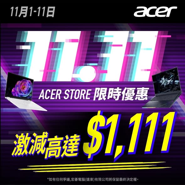 Acer「11.11限時勁減賞」網店獨家優惠現已登場! 活動期間消費愈多, 折扣愈勁, 最高可享即減 $1,111優惠! 我們希望藉助貴平台的力量,將這次一年一度的限時優惠推廣給更多受眾, 一同以最抵價入手心水產品!