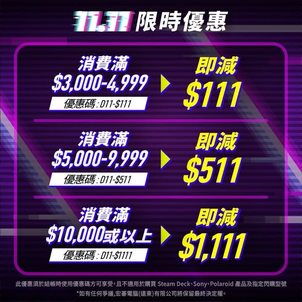 (*須於結帳時輸入優惠碼方可享受,不適用於 Steam Deck、Sony、Polaroid 產品及指定閃購型號。)