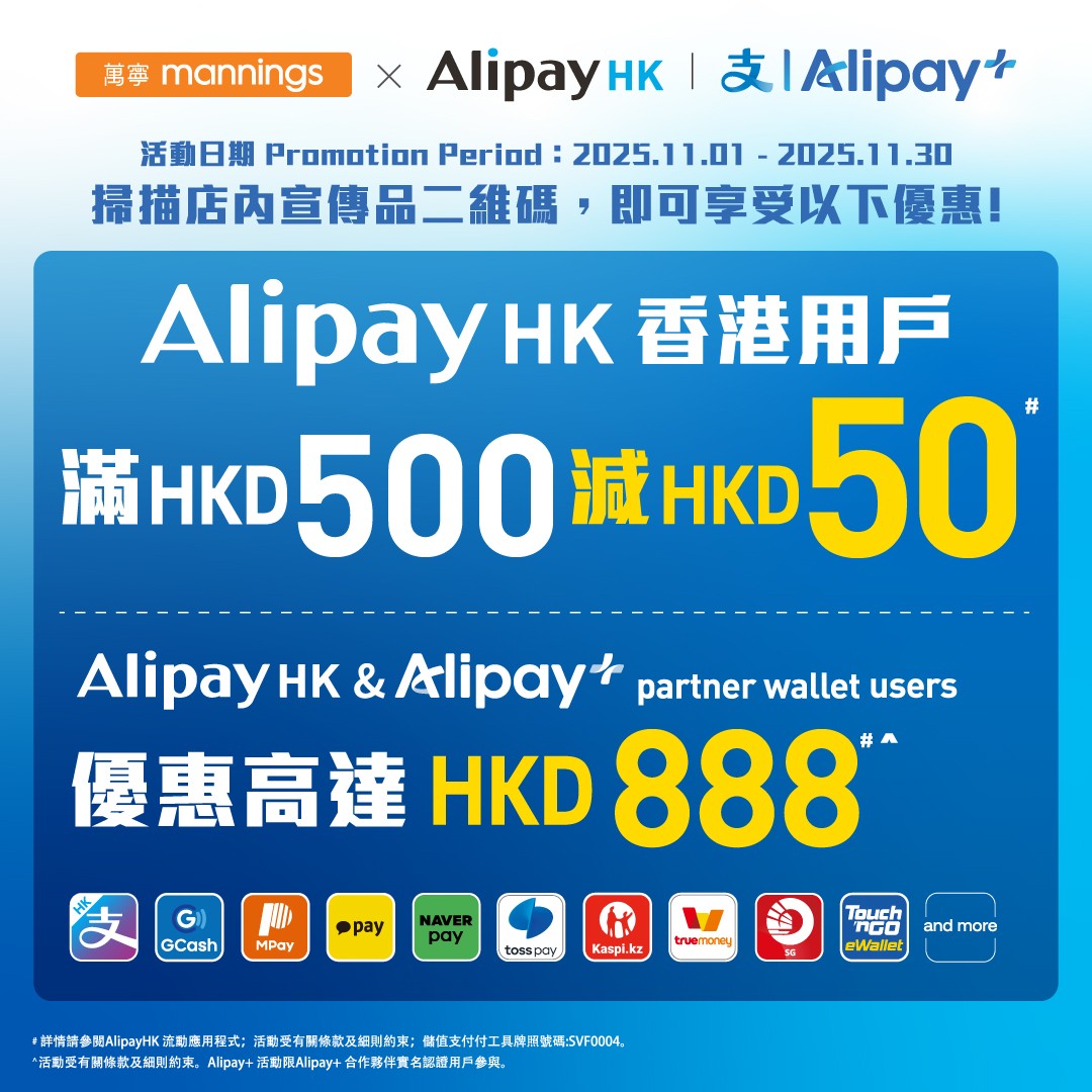 立即Click入萬寧官方網店,選購更多超值貨品~:http://bit.ly/3JpVw5B由即日起至11月30日,透過Alipay HK流動應用程式掃描店內宣傳品嘅二維碼,就可以拎到消費滿HK500 即減HK50 嘅禮券#,買得多慳得更多!/Alipay+合作錢包用戶仲可以享受高達HK$888嘅優惠#^/快啲嚟萬寧打開Alipay HK App,睇吓點樣拎盡著數啦!