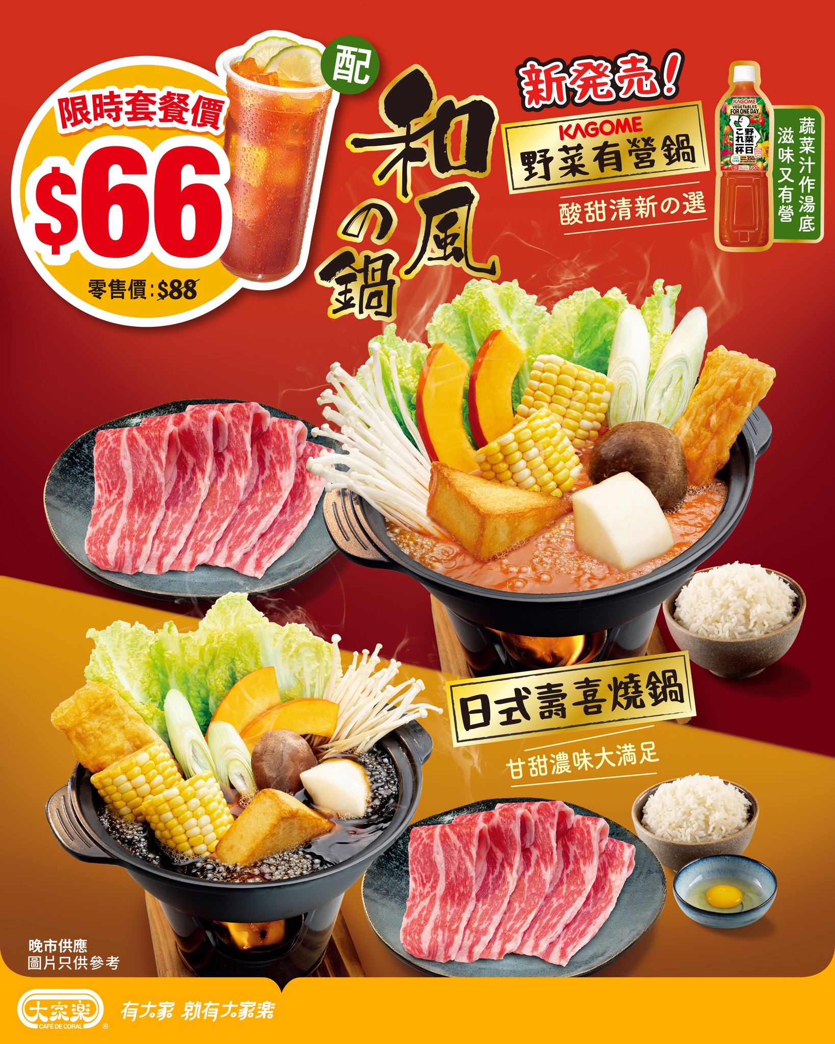 指定分店有售,晚市時段供應#CafedeCoral#CafedeCoralhk#大家樂#有大家就有大家樂#和風の鍋#KAGOME#野菜有營鍋#日式壽喜燒鍋#暖胃之選#鴨屎香香水檸檬茶#秋冬必食#晚市限定