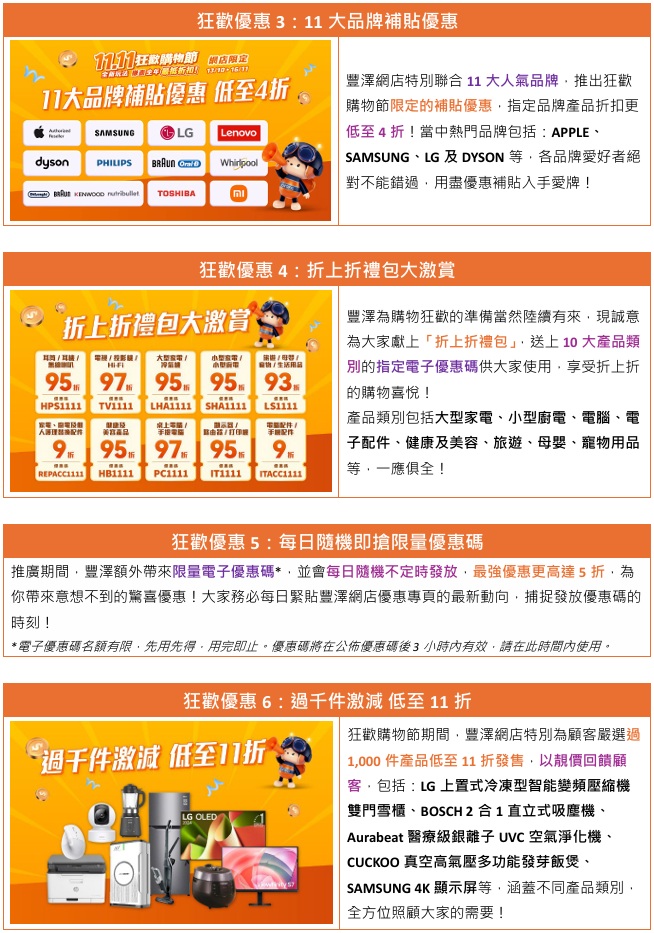 為增添購物樂趣,豐澤網店於推廣期內每日上演驚喜優惠大放送!狂歡優惠包括 (1) 雙11一日限定的「熱賣產品勁抵開搶低至$11」,$11、$111及$1,111超抵價讓大家快搶好物、 (2) 「人氣產品秒殺價每日準時開搶」每日精選10大秒殺價產品、 (3) 「11大品牌補貼優惠」熱門品牌雲集為豐澤網店帶來限定補貼優惠、 (4)「折上折禮包大激賞」加碼為10大產品類別提供折上折優惠碼、 (5) 「每日隨機即搶限量優惠碼」享高達5折優惠、以及 (6) 於購物節期間帶來「過千件激減低至11折」,總有一款優惠產品合你心水,快趁折扣滿瀉的雙11來豐澤網店盡慶購物狂歡!