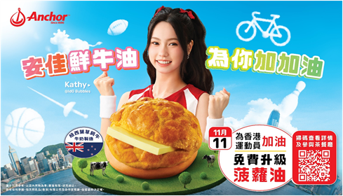 為進一步為港隊打氣,安佳更邀得人氣女團團員 Kathy@idG Bubbles成為活動大使,在11月期間引入大型巴士廣告,穿梭全港各區,為每位運動員送上最熱烈的支持。安佳盼透過活動,讓全港市民都能享受鮮牛油的美味,亦讓活力滿滿的加「油」精神遍及全港,一齊品嚐美味絕倫的「安佳菠蘿油」,同時為港隊加「油」!