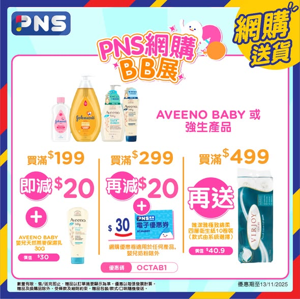 滿$199,即減$20及送Aveeno Baby 嬰兒天然燕麥保濕乳30克 (價值$30)