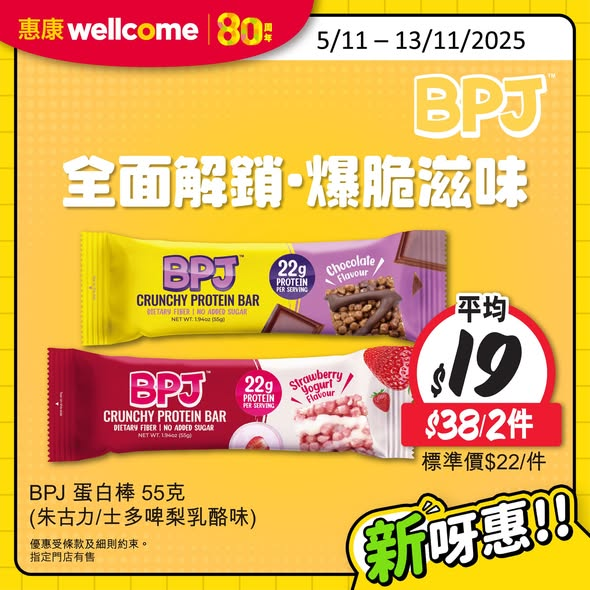 BPJ 蛋白棒(朱古力/士多啤梨) 55克 優惠價$38/2件*,平均$19/件每條蛋白棒含22克蛋白質,少於200卡路里,無添加糖配方,結合香濃朱古力同勁脆蛋白波波一啖咬落去,爆脆滋味直達 Max 等級