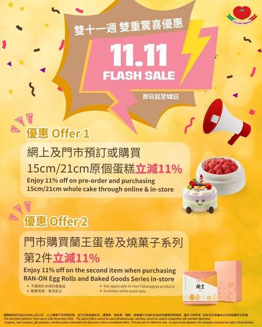 【雙十一週雙重驚喜優惠】雙11狂歡來襲! 即日起至11月12日,Italian Tomato為你準備雙重驚喜優惠門市或網店購買/預訂15cm/21cm原個蛋糕,立減%蘭王蛋卷及燒菓子系列第2件立減%把握機會享用以上優惠,盡情地探索你最愛的Italian Tomato滋味吧!