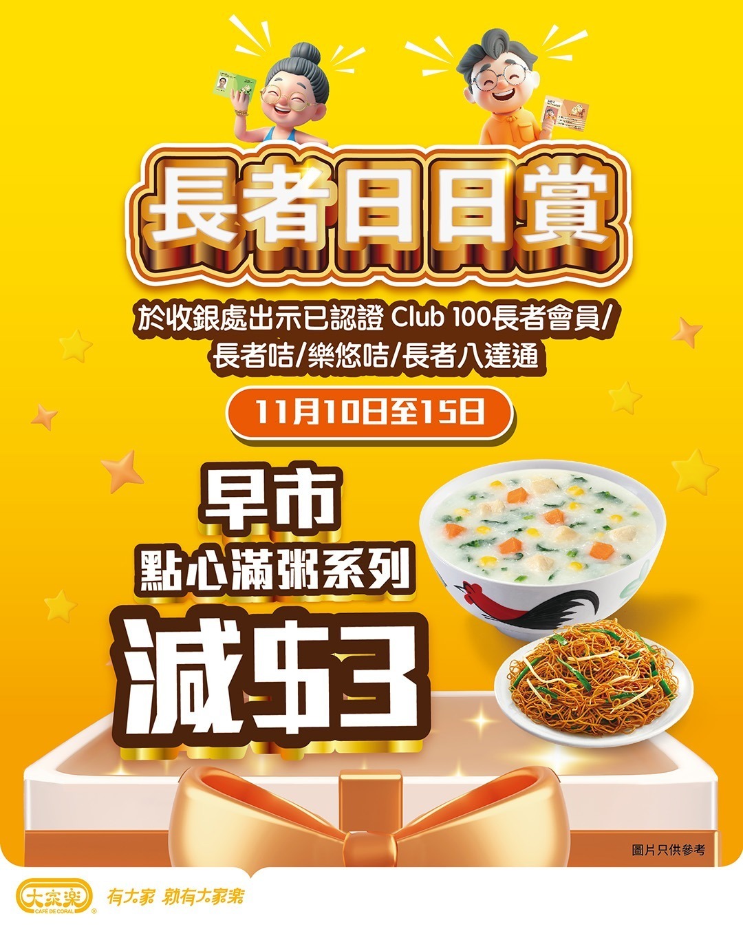 #CafedeCoral#CafedeCoralhk#大家樂#有大家就有大家樂#Club100#長者優惠#早市限定#點心滿粥#暖笠笠靚粥#老友記著數#暖心早餐#長者日#長者日先行優惠