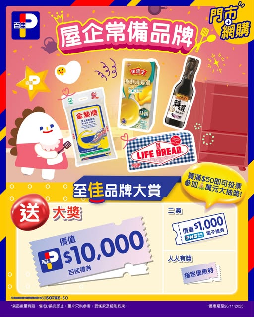 大抽獎,隨時贏走價值$10,000 嘅超級大獎返屋企!而且只要買指定品牌產品或者去PNS網購購物,都可以拎多次額外抽獎機會!快啲嚟百佳旗下超市或PNS網購入貨,投票再贏走豐富獎品*返屋企啦!!