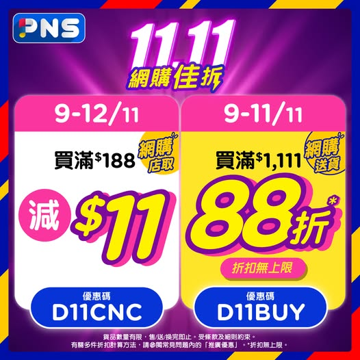 買網購店取訂單滿$188,輸入優惠碼「D11CNC」,即減$11
