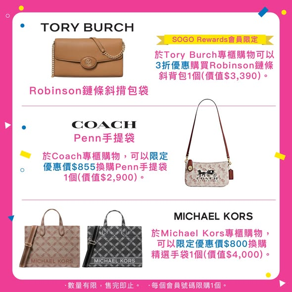 【崇光感謝周年慶 Part 2 限定優惠登陸啟德店】想換個新造型過秋冬?崇光啟德店 G/F & 1/F 推出一系列人氣熱賣袋款,以限定優惠價發售!日常百搭、上班必備,定係約會靚款,全方位滿足你嘅造型需要。 趁住感謝周年慶 Part 2 優惠入手,升級衣著品味,袋住自信出街啦~