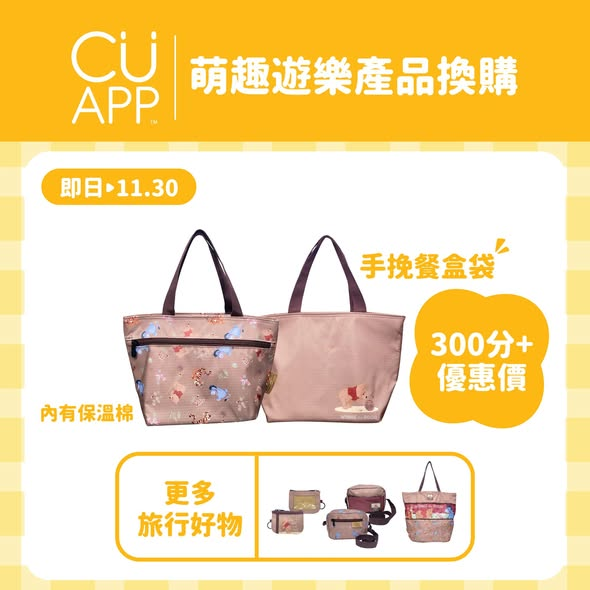 最適合同朋友外出遊玩。CU APP最新換購活動有可愛趣緻Monchhichi及Winnie the Pooh產品,例如行李箱、輕便袋、餐盒袋、散紙包及摺曡式手挽袋等,全部印上卡通圖案,可愛天真嘅造型令人愛不釋手,帶住佢地外遊更添樂趣