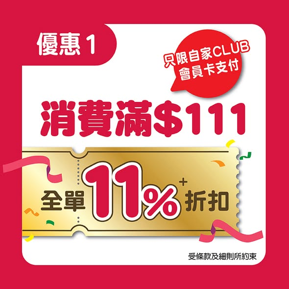 ^此優惠不可與自家CLUB 95折、自家CLUB生日折扣、入會折扣及其他全單折扣優惠同時使用,亦不可以指定推廣優惠同時使用