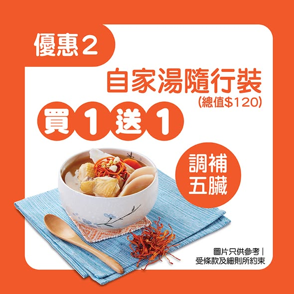 *優惠適用於自家湯、靈芝龜苓膏、藥製龜苓膏、自家涼茶、自家甜品之產品系列套券、升級版圍村豐味盆菜e券(半年期)、至尊素食盆菜e券(半年期)