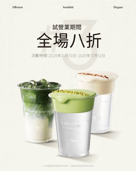 【#新店速遞 椰椰椰! 人氣椰飲Yee3登陸apm 】 oh 椰~ 爆紅嘅椰飲品牌Yee3正式進駐apm啦! 佢哋主打天然椰水+椰乳+椰肉三重配搭,做到輕卡、輕味、輕鬆,飲完0負擔,成個人都refresh晒!為咗慶祝Yee3開業,#試業優惠 一浪接一浪:即日起至11月12日,全場飲品8折!由11月13日至19日一連7日,以下6款人氣飲品買一送一*:指定款式包括招牌開心果椰子糖、薄荷曼波椰子糖、海鹽芝士椰子糖、生椰抹茶、冰椰重瓣玫瑰及冰川藍椰 其他飲品亦可享8折優惠!*每日限量200杯,送完即止!即刻揀返杯心水口味,放學放工同朋友嚟apm開心飲返杯!Yee3 | Shop L4-28