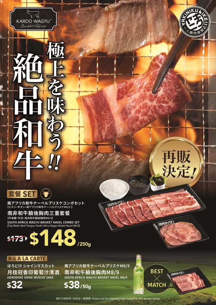 「燒肉LIKE」再次引入好評如潮的南非頂級和牛!全新「南非和牛腩後胸肉三重套餐」嚴選達M8/9等級的南非和牛(Karoo Wagyu),承襲優良血統,以動物營養專家調配的天然飼料餵養,確保每一片肉都是純淨自然的頂級享受。主打的後胸肉位於牛肋骨附近,運動量充足使肉質結實有嚼勁,油花與筋膜交織,肉汁豐富!經燒烤後,牛肉組織慢慢分解,口感變得無比軟嫩,層次豐富!套餐更配上肉香十足的牛板腱、爽脆彈牙的牛舌,三重風味一次滿足,盡享奢華燒肉體驗!推廣期內更可以超抵價$38/50g或$68/100g單點「南非和牛腩後胸肉」,盡情享受南非和牛的極致美味!
