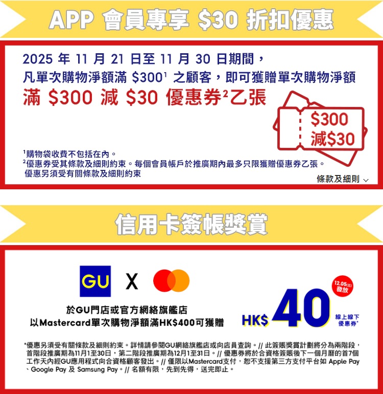 *條款及細則:於網絡旗艦店消費必須選擇單一配送方式。// GU將於2025年12月1日經GU應用程式 (「我的帳戶」>「優惠券」)向合資格顧客發出優惠券。// 使用效期或有機會更改,詳情請參閱優惠券。// 顧客必須成功註冊為GU會員方可享用此優惠。// 於門店結帳時(不論於收銀枱或自助收銀機):顧客必須確保其會員帳戶條碼被成功掃描,以供GU記錄其獲發優惠券之資格,否則顧客將不會獲發放優惠券,而GU亦不會向其補發優惠券。// 於官方網絡旗艦店結賬時:顧客必須於結賬前成功登入其賬戶以完成有關訂單,否則GU將無法就優惠券發放記錄其獲發優惠券之資格,顧客將不會獲發放優惠券,而GU亦不會向其補發優惠券。// 此優惠不能與其他優惠及現金券同時使用。// 如有任何爭議,GU Hong Kong Apparel Limited保留最終決定權。
