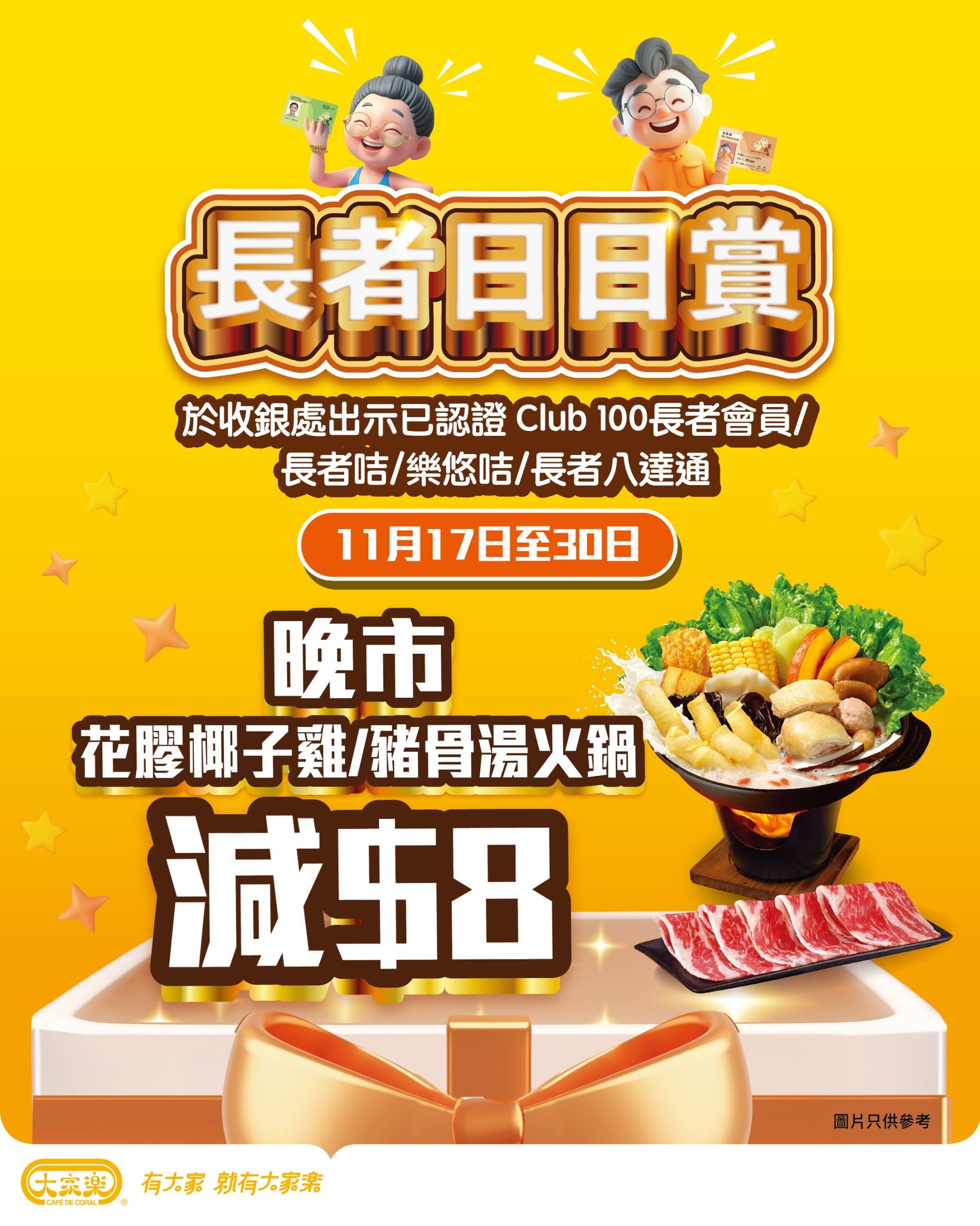 #CafedeCoral#CafedeCoralhk#大家樂#有大家就有大家樂#Club100#長者優惠#長者日#長者著數#暖聚打邊爐#花膠椰子雞火鍋#豬骨湯火鍋#冬日滋味#老友記聚會#慳住歎#晚市限定