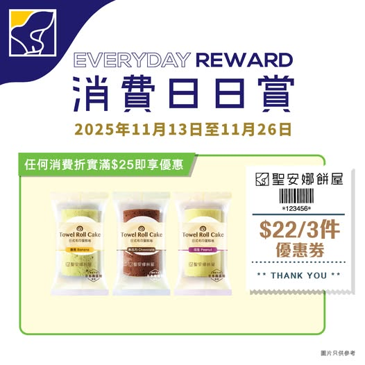 【$22/3件日式毛巾蛋糕卷】聖安娜日式毛巾蛋糕卷採用日本海藻糖配方,口感鬆軟幼滑!由即日起至11月26日,嚟聖安娜惠顧滿$25,就可以攞到$22/3件日式毛巾蛋糕卷優惠券一張!有香蕉、朱古力及花生3款口味任你揀,日日唔同口味都得呀 !產品資料:日式毛巾蛋糕卷(各款口味)原價: $10/件了解更多 https://bit.ly/4i5kPXt*優惠受條款及細則約束