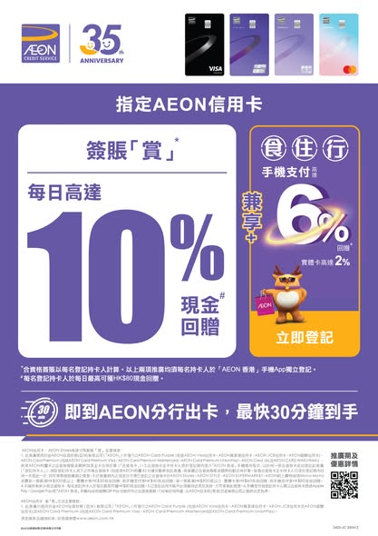 【指定AEON信用卡簽賬 尊享高達10%現金回贈 + 兼享紫「賞」生活高達6%現金回贈! 】