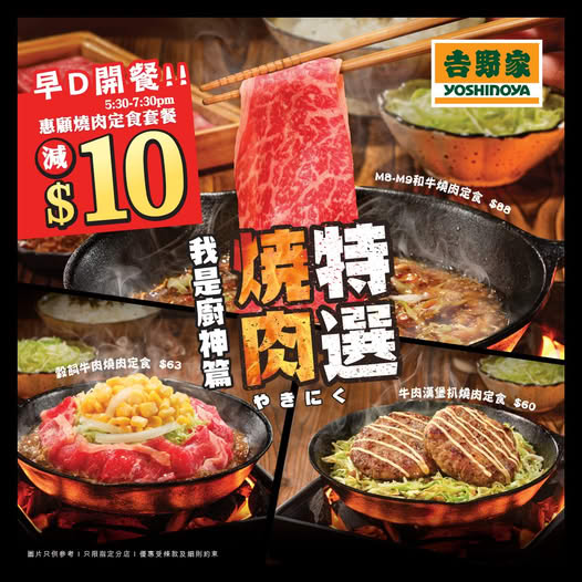 #燒肉特選 現已新增至全港49間分店供應!仲有『早鳥減$10優惠 』!勁著數呀!由即日起,下午 5:30 至 7:30 來到指定分店,惠顧 #燒肉定食套餐,即可享受減 $10 優惠!3款滋味燒肉定食套餐 #牛肉漢堡扒:自家製漢堡扒,獨特惹味,不一樣嘅享受! #M8-M9和牛:濃郁牛香,肉質滑嫩又有彈性,每一口都充滿肉汁滋味! #穀飼牛肉:選用優質穀飼牛肉,搭配蒜香燒汁,肉質鮮嫩,口感極佳!快D黎吉野家享受超抵價燒肉套餐啦!=================================*圖片只供參考 | 只適用於晚市堂食 | 只限指定分店供應 | 餐種及飲品供應以各別分店為準 | 優惠須受條款及細則約束即刻下載吉野家族APP登記成為會員消費儲分,再拎埋獨家優惠啦! http://bit.ly/4hCLYjL